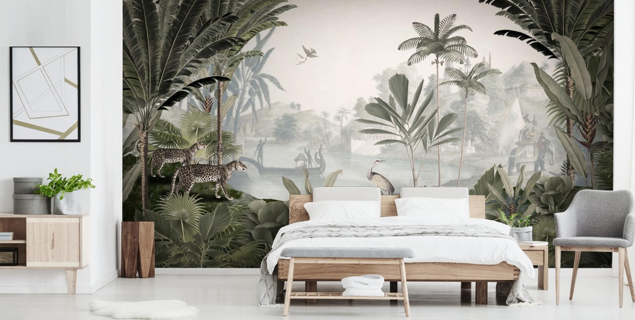 Wil je tropische sferen creëren in je huis? Kies dan voor deze prachtige Green Leopard Landscape-muurschildering gemaakt door Sir Edward. Net als ons andere Leopard Landscape-behang is dit ontwerp veel rijker aan groene tinten.