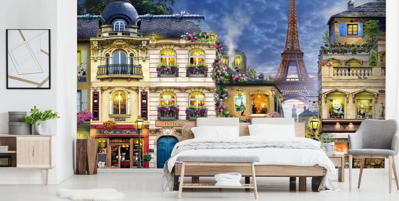 Stap het oude Parijs binnen met deze prachtig geïllustreerde muurschildering van Parijs. Met de iconische Eiffeltoren op de achtergrond en de mooie traditionele winkelfronten kun je echt geen Parijs behang vinden dat mooier is dan dit.