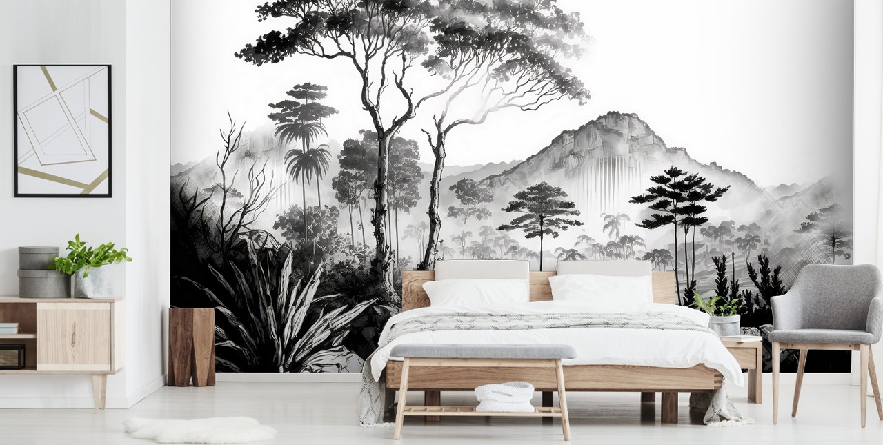 Creëer een kamer met uitzicht met deze stijlvolle monochrome landschapsmuurschildering uit onze Wilderness-collectie.