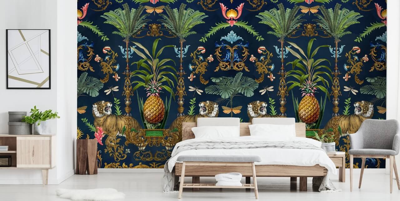 Koop deze op maat gemaakte tropische behangmuurschildering met siertijger, gemaakt door Andrea Haase. Perfect voor een exotische slaapkamer!