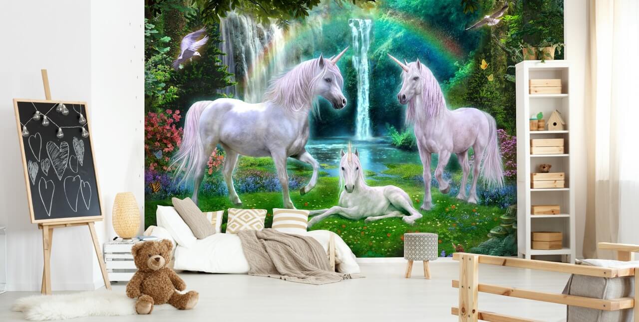 Transformeer je huis met dit magische Rainbow Unicorn Family behang. De prachtige eenhoorns, waterval, regenboog en mooie vlinders zijn buitengewoon mooi!
