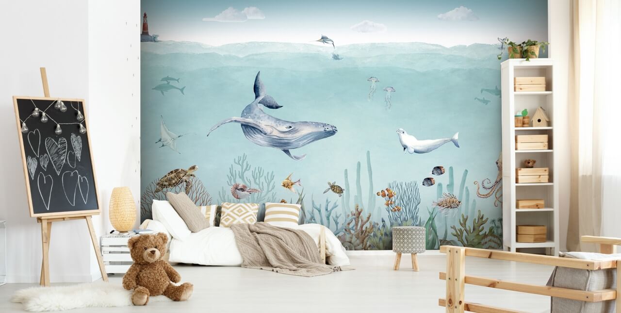 Combineer dit walvisbehang met een wit kinderbedje en commode en een lichtblauwe fauteuil. Kies ingelijste visprints voor de andere muren en een vismobiel.