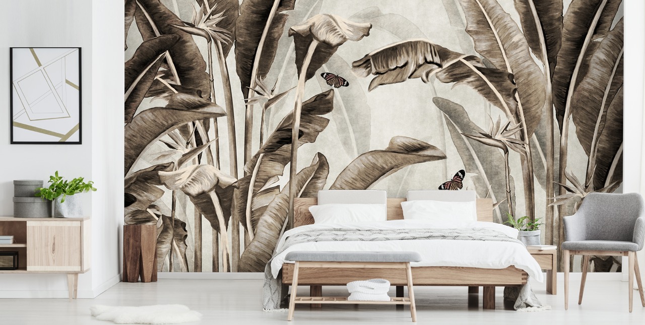 De muurschildering van Sepia Palm Leaves and Butterflies maakt deel uit van onze spectaculaire Wilderness-collectie. Het is een boeiend ontwerp dat perfect is voor een eenvoudige muur die anders een beetje saai zou aanvoelen.