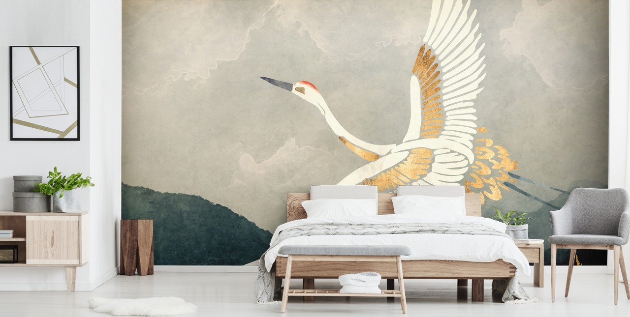 Ben je dol op oosters en art deco-behang? Bekijk deze op maat gemaakte Elegant Flight behangmuurschildering.