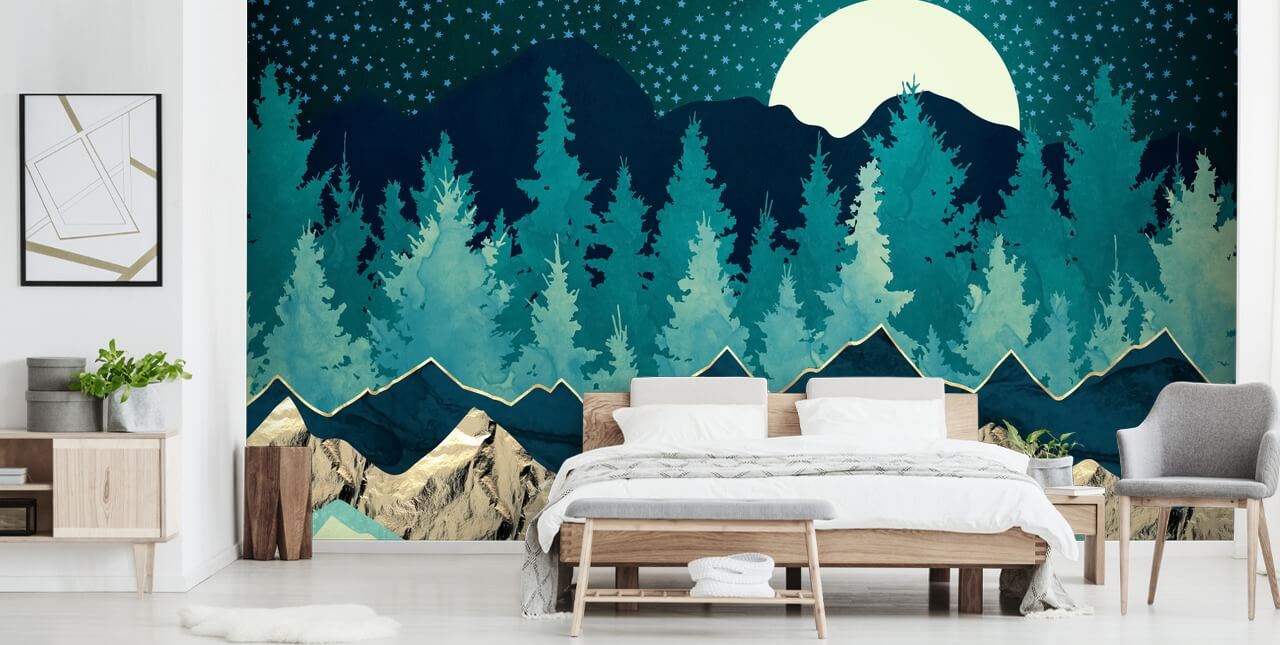 Voeg dit dromerige Sage Forest-behang toe aan uw huis voor een onmiddellijke verfrissing van het decor! We denken dat deze prachtige nachtelijke muurschildering perfect zou zijn om een rustgevende sfeer aan elke kamer toe te voegen.