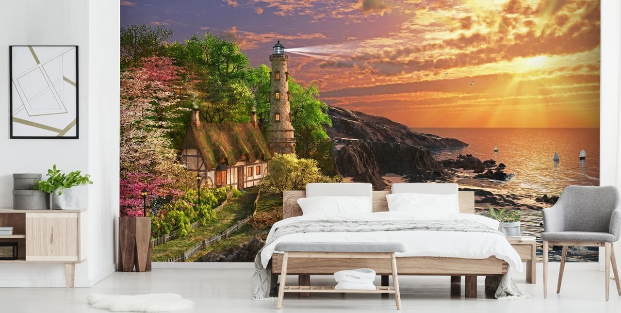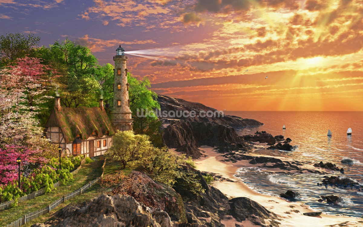 We houden van dit mooie strandbehang omdat het zo mooi en dromerig is. De combinatie van de warme zonsondergang, het water dat over de rotsachtige kust crasht en het idyllische huisje van de vuurtorenkeeper met rieten dak, straalt gewoon romantiek uit. We willen graag in deze scène stappen. Zou je dat willen?