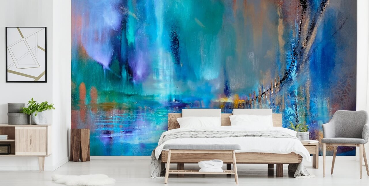 Combineer dit artistieke schilderbehang met een reeks blauw- en goudkleurige accessoires om de verschillende tinten in het ontwerp naar voren te brengen. Bijvoorbeeld een marinebank met een gouden lamp ernaast.