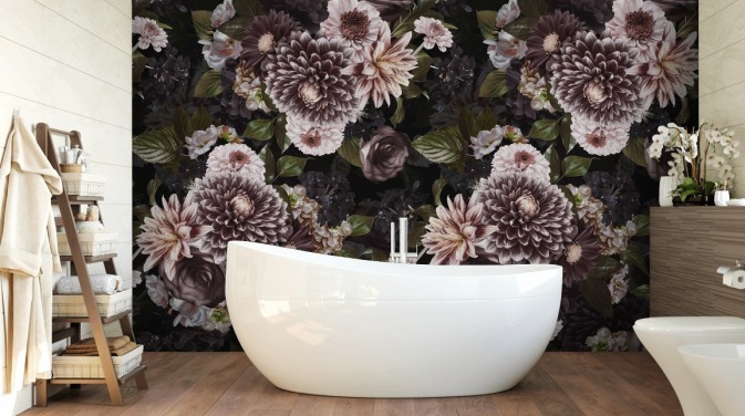 donkere bloemen in paars en roze behang