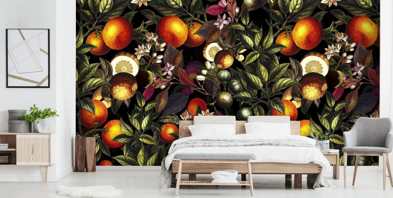 Omarm warme oranje tinten in je huis met dit op maat gemaakte Vintage Fruit behang uit onze Burcu Korkmazyurek collectie.
