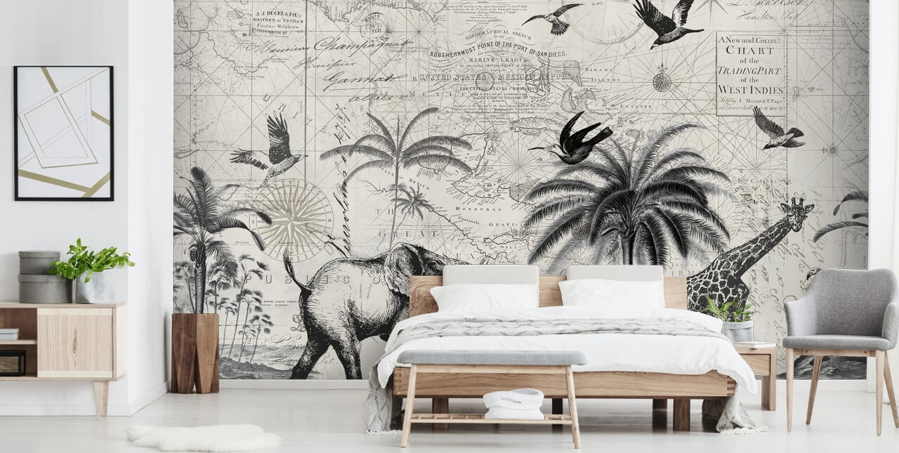 Kies voor een stijlvolle zwart-witte jungle muurschildering deze prachtige muurschildering van Wild Animals Journey. Het verbluffende detail van de dierenillustraties in vintage-stijl zijn kunstwerken in zichzelf en de unieke kaartachtergrond voegt een diepte van textuur en patroon toe aan dit prachtige ontwerp.