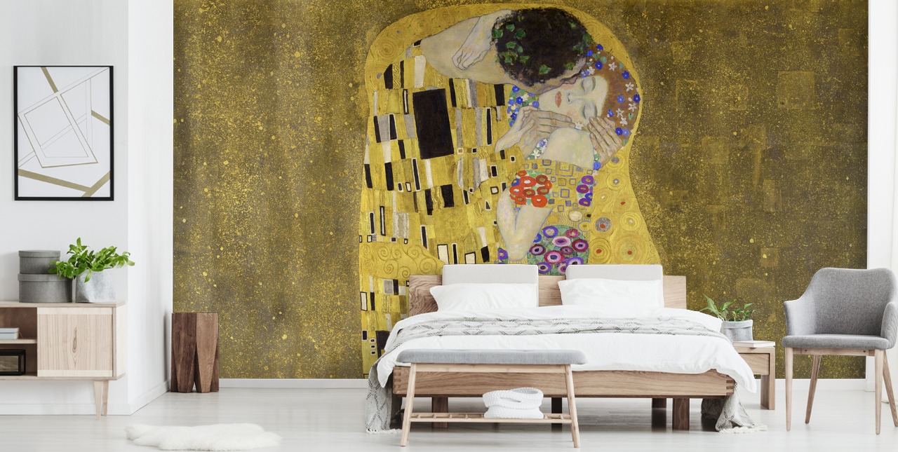 Laat je liefde voor beeldende kunst zien met onze op maat gemaakte behangmuurschildering The Kiss van Gustav Klimt.