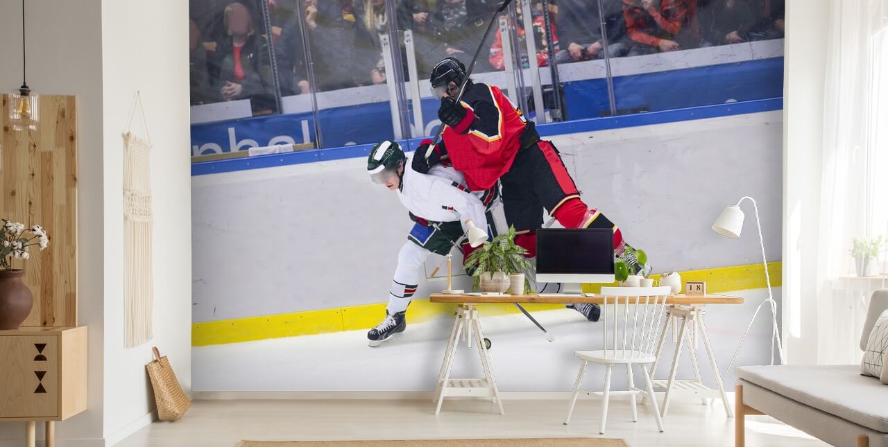 Ga het ijs op met onze Ice Hockey Heavy Tackle behangmuurschildering, op maat gemaakt voor je muur door Wallsauce.