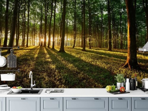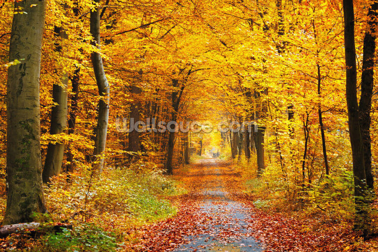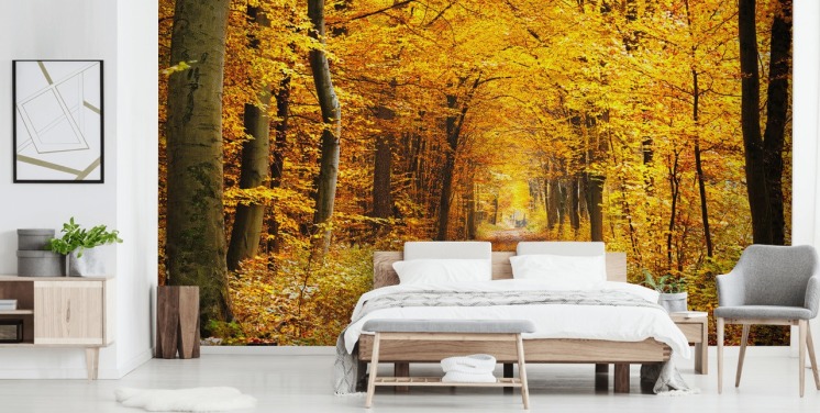 gele en oranje bosbehangmuurschildering genaamd Autumn Forest with Yellow Leaves voor lounges, kantoren aan huis en slaapkamers