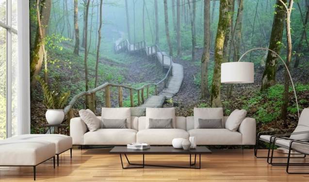 groene en bruine op maat gemaakte bosbehangmuurschildering genaamd Foggy Forest Stairway