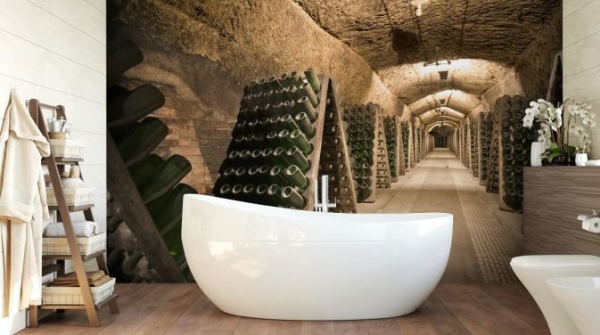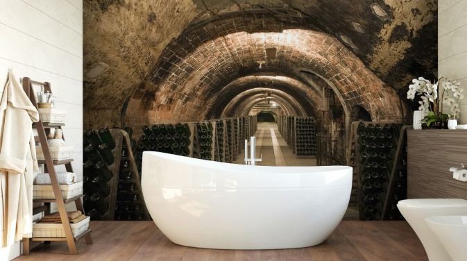 bruine en grijze 3D-wijnkelder behangmuurschildering genaamd Cave à Vin voor kelders en keukens