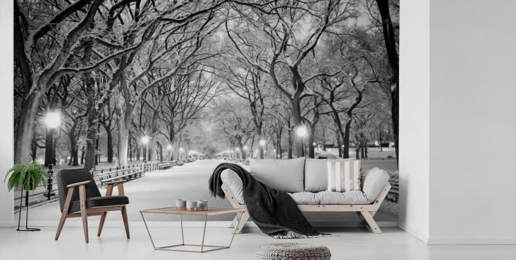 monochrome op maat gemaakte New Yorkse muurschildering genaamd Central Park Covered in Snow voor woonkamers of eetkamers