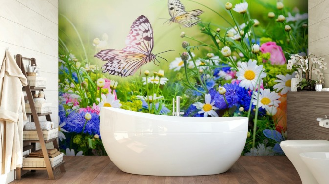 blauwe, groene en witte aanpasbare muurschildering met vlinders genaamd Butterflies and Flowers voor bedrijven, verzorgingstehuizen en gangen