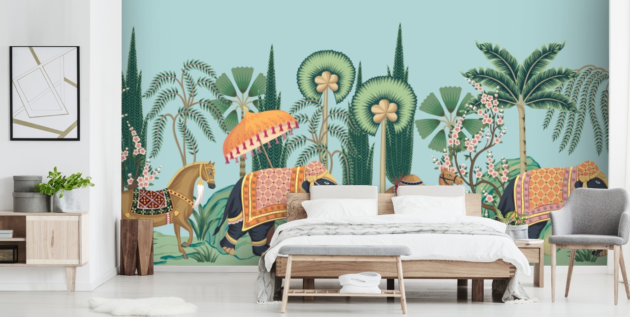 Transformeer de muur van een slaapkamer of woonkamer met onze prachtig charmante Chinoiserie Animal Parade behangmuurschildering.