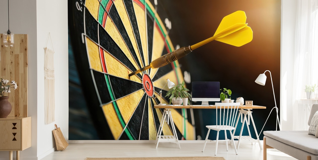 Breng de magie van darts tot leven in uw huis of bedrijf met deze stijlvolle Dart Board behangmuurschildering van Wallsauce.
