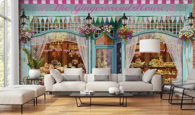 op maat gemaakte gevelbehangmuurschildering genaamd Village Shop voor verzorgingstehuizen