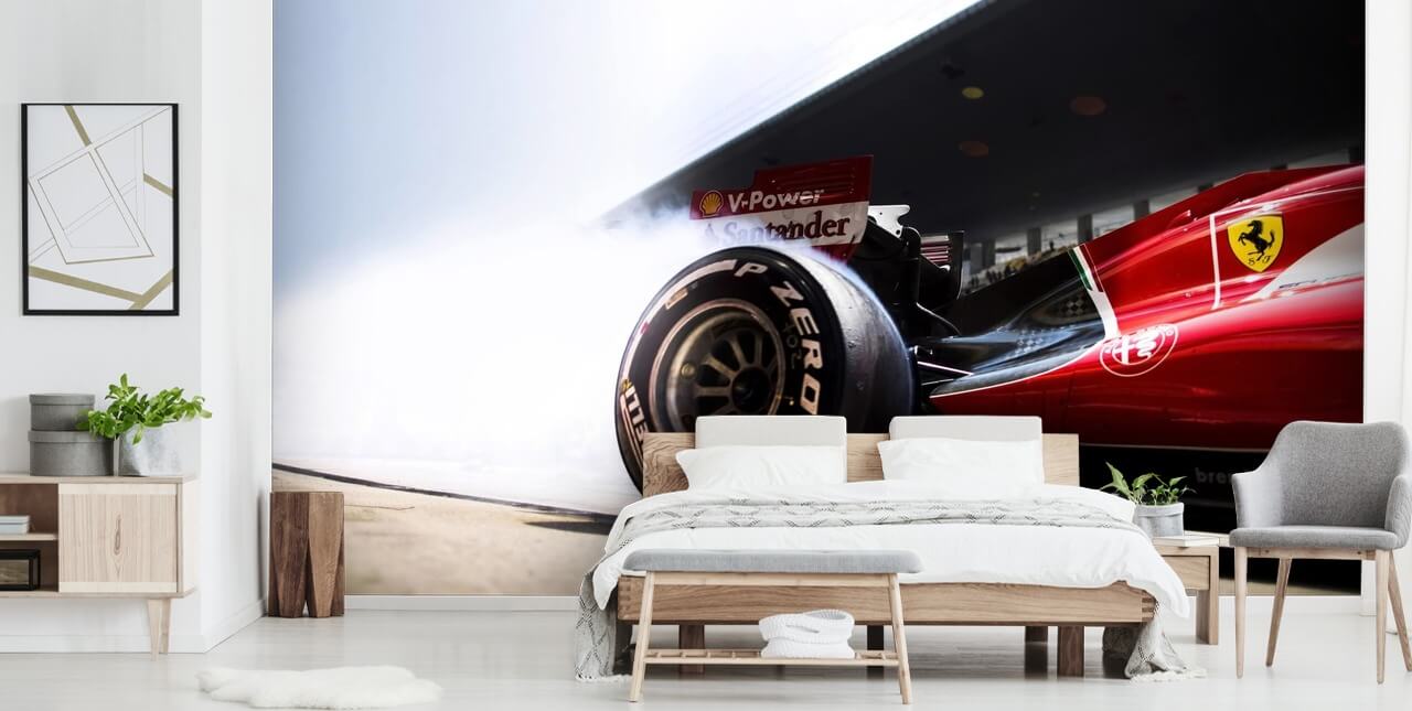 Als je van Ferrari-auto's houdt, bekijk dan deze op maat gemaakte Ferrari F1-muurschildering. Verkrijgbaar in peel and stick or paste the wall wallpaper.