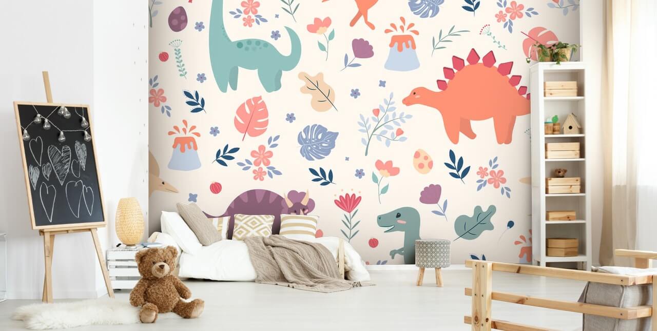 Transformeer de slaapkamer van je kind met deze op maat gemaakte Floral Dino muurschildering.