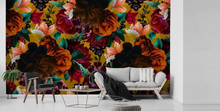 donkere bloemen gouden tinten behang