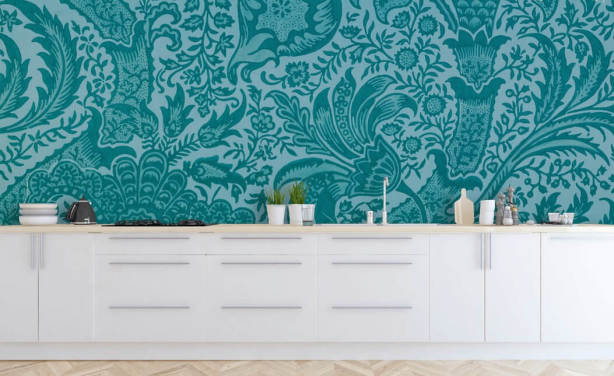 vintage behang met wit en groenblauw patroon