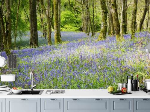 blauwe en groene bosbehangmuurschildering genaamd Bluebell Woodland voor slaapkamers of eetkamers