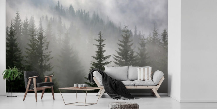 donkergroene bosbehangmuurschildering op maat genaamd Pine Forest in Mist voor keukens en eetkamers