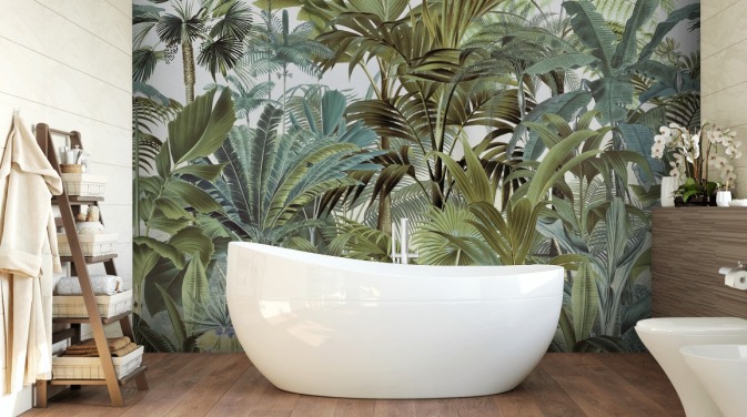 groene en roze aanpasbare tropische jungle behangmuurschildering genaamd Tranquil Jungle voor badkamers