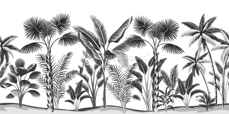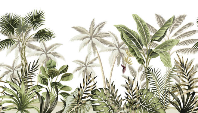 vintage groene op maat gemaakte palmblad jungle behangmuurschildering genaamd Tropical Landscape 2 van Andrea Haase voor slaapkamers