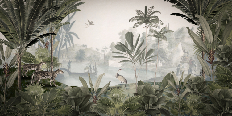 vintage geïllustreerde jungle behangmuurschildering genaamd Elephant Elegance van Sir Edward voor slaapkamers en woonkamers