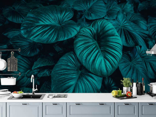 behangmuurschildering met blauwe bladeren genaamd Hanging Tropical Palm Trees Blue voor slaapkamers, woonkamers en badkamers
