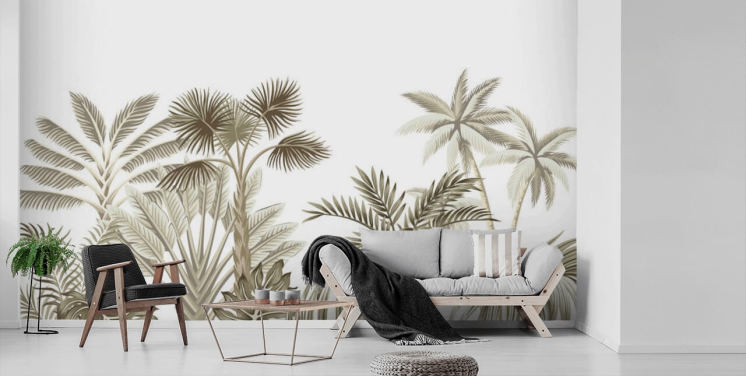 zeer subtiele bruine geïllustreerde jungle op witte achtergrond muurschildering