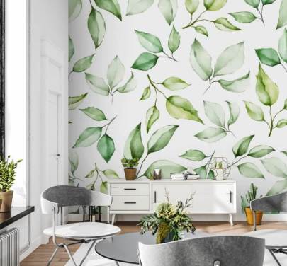 behangmuurschildering met groene bladeren genaamd Green Autumnal Leaves voor badkamers, slaapkamers en kantoren