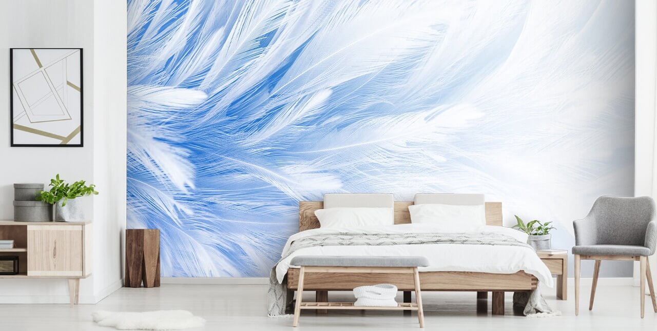 Breng een gevoel van rust en sereniteit in uw huis of werkplek met deze rustgevende muurschildering met lichtblauwe verenprint.