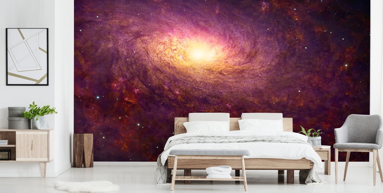 Als je een ruimteliefhebber bent en een geweldige Galaxy-sfeer in je kamer wilt brengen, dan is dit het behang voor jou! Perfect als achtergrond voor je bed, combineer het eenvoudig met een wit bedframe voor een prachtig contrast en kies voor donkerroze en paarse lakens. Kies voor een zichtbare houten vloer, maar leg een groot, rond vloerkleed aan de voet van je bed om een vleugje gezelligheid toe te voegen aan je ruimte — wij denken dat een diep, paars vloerkleed er geweldig uit zou zien!