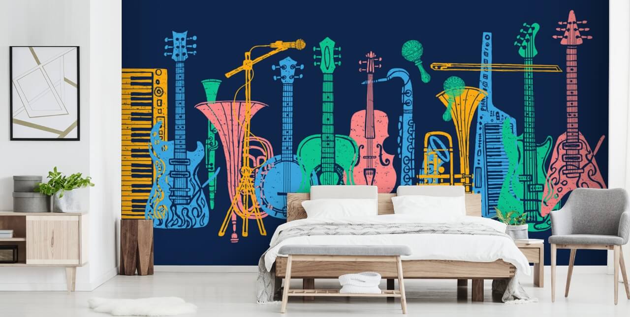 Ben je muzikant of hou je gewoon van muziek? Bekijk dan deze kleurrijke en leuke muurschildering voor muziekinstrumenten!