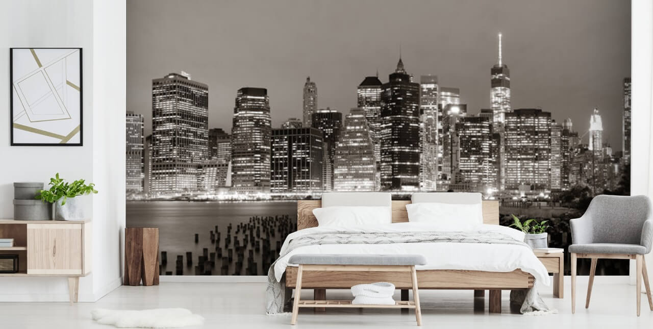 Versier je muren met deze prachtige, op maat gemaakte New York at Night behangmuurschildering van Wallsauce.com.
