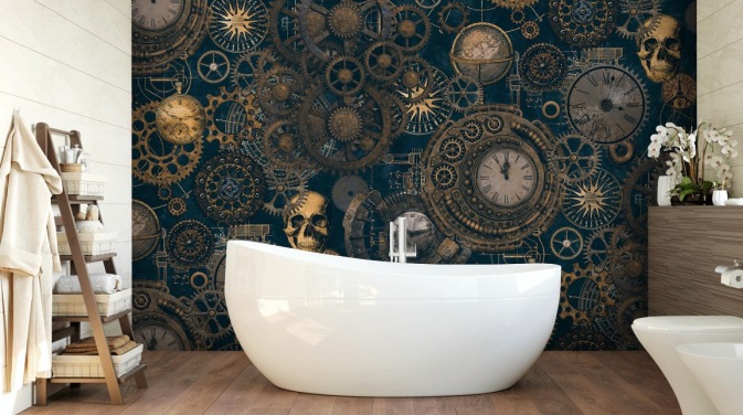 marineblauwe en gouden steampunk muurschildering genaamd Steampunk van Andrea Haase voor slaapkamers en woonkamers