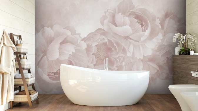 grote bloemenmuurschildering met blozende roze pioenrozen van Marina Stupakova voor slaapkamers