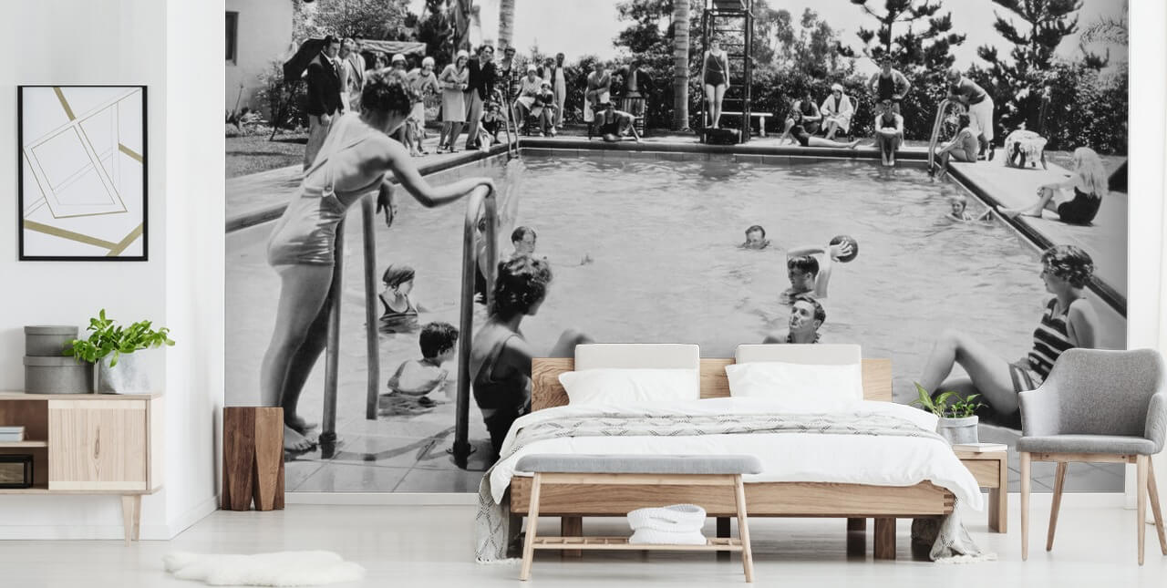 Introduceer de nostalgische charme van vervlogen tijden in uw verzorgingstehuis met de betoverende zwart-witte Pool Party behangmuurschildering.