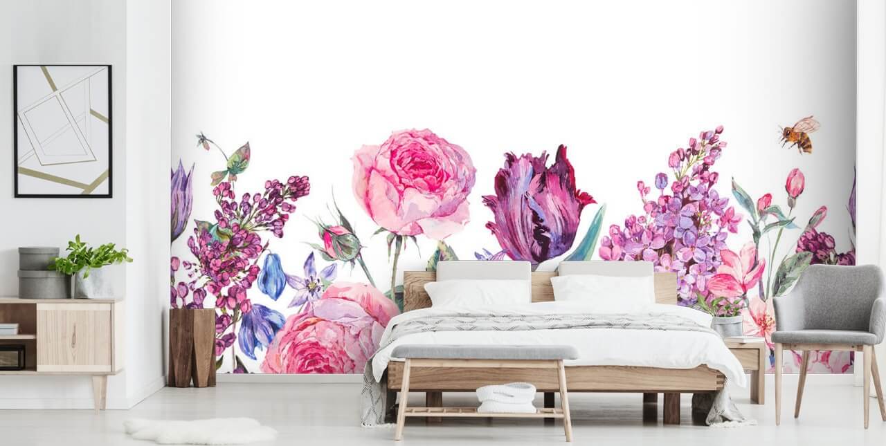 Dit prachtige bloemenbehang zou er geweldig uitzien met witte of lichtlila muren. Kies voor witte meubels en paarse en roze kameraccessoires. Waarom niet kiezen voor metallic roségouden accenten om de roze tinten van de bloemen te weerspiegelen? Roségouden lampen en kandelaars zouden er allemaal prachtig uitzien met deze prachtige bloemenmuurschildering.
