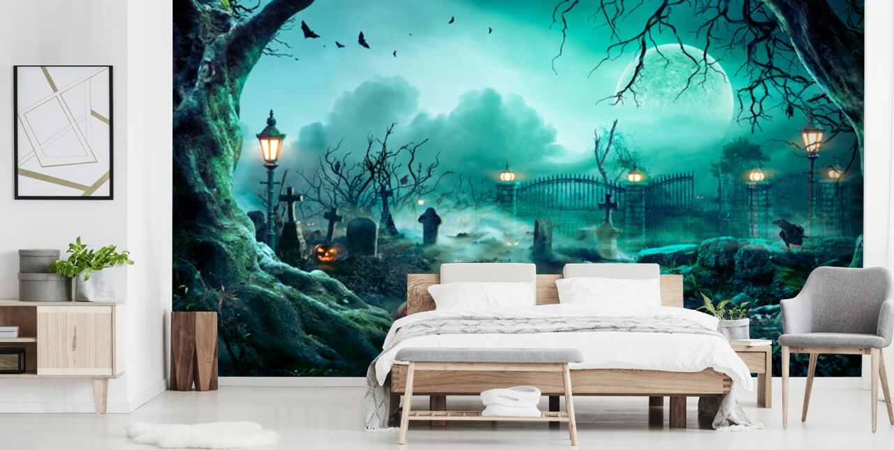 Creëer een spookachtige sfeer in je huis met deze op maat gemaakte Pumpkin Graveyard muurschildering van Wallsauce. Het perfecte Halloween-behang voor een feestje! Bestel door ons te bellen of het bestelformulier op deze pagina in te vullen.