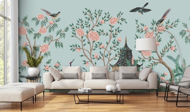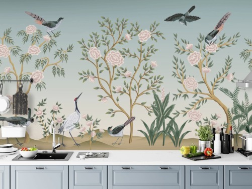 blauwe chinoiserie behangmuurschildering genaamd Blue Chinoiserie Bird Sanctuary voor slaapkamers en woonkamers