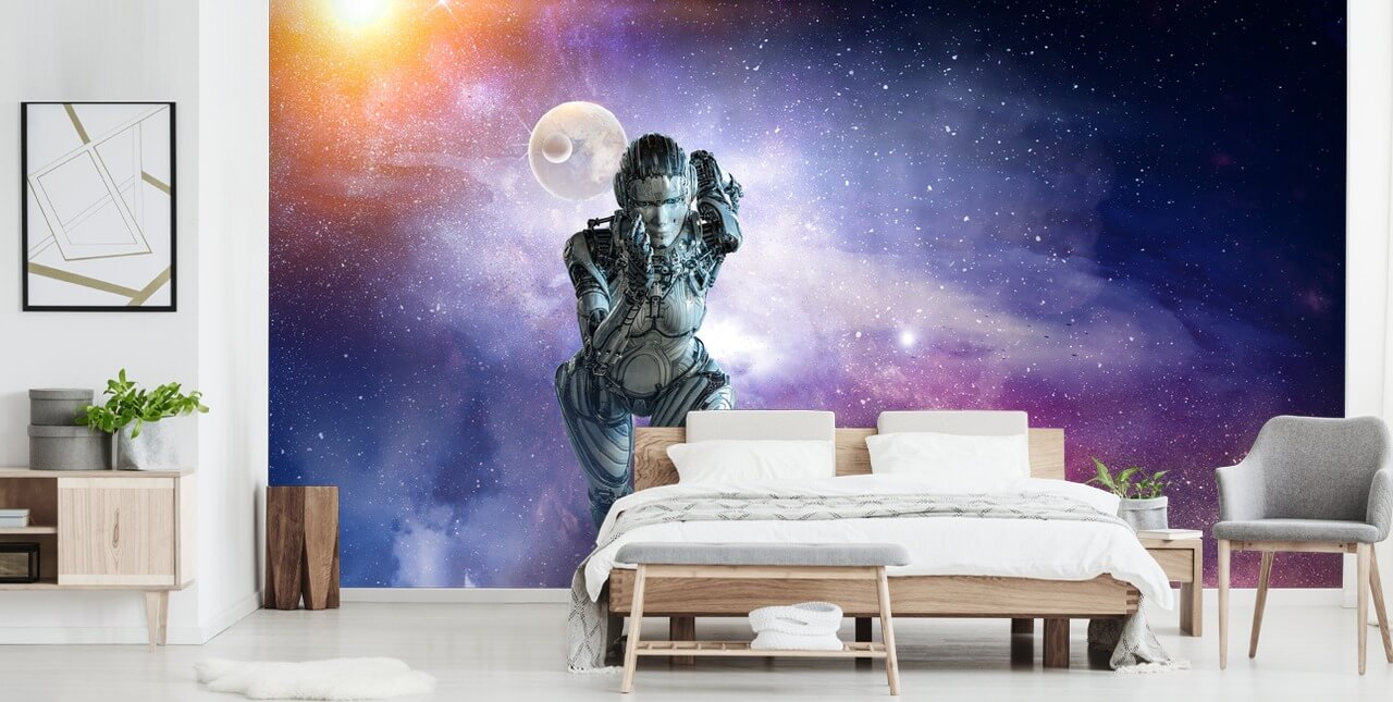 Verander een kamer in een buitenaards ruimteschip, een landschap vol draken of een futuristische woestenij met een fantasiebehangmuurschildering. Neem een eenvoudige, saaie muur en maak er iets spectaculairs van met sciencefictionbehang dat tot de verbeelding spreekt van iedereen die hem ziet.