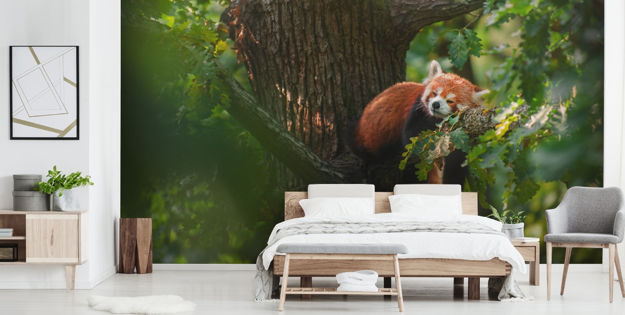 Creëer een ontspannen en vredige sfeer in je slaapkamer met Sleeping Red Panda, een charmante panda-behangmuurschildering.