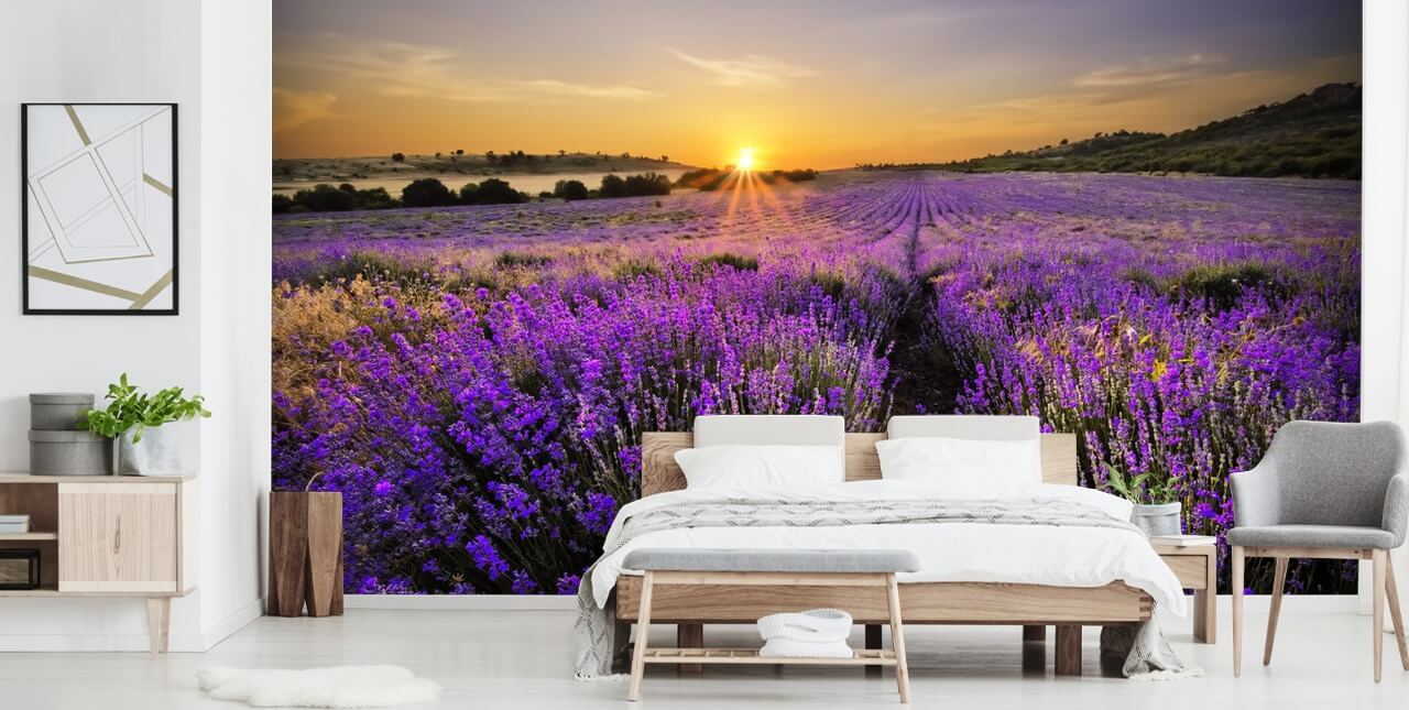 Je ruikt bijna het heerlijke parfum met dit op maat gemaakte Sunset Over Lavender Field behang.