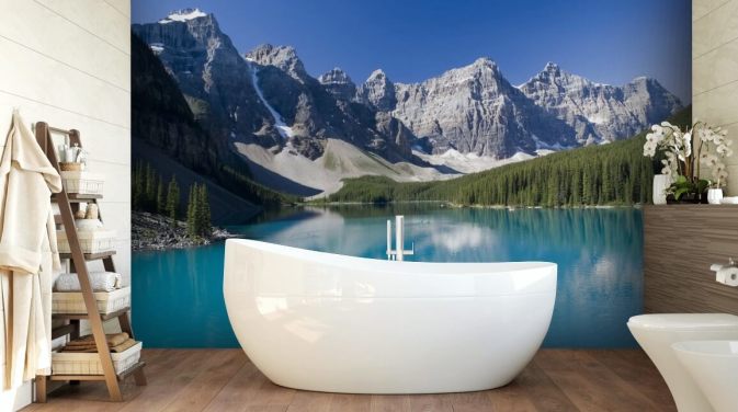 blauwe op maat gemaakte meer- en bergmuurschildering genaamd Lake Moraine in Banff National Park voor kantoren